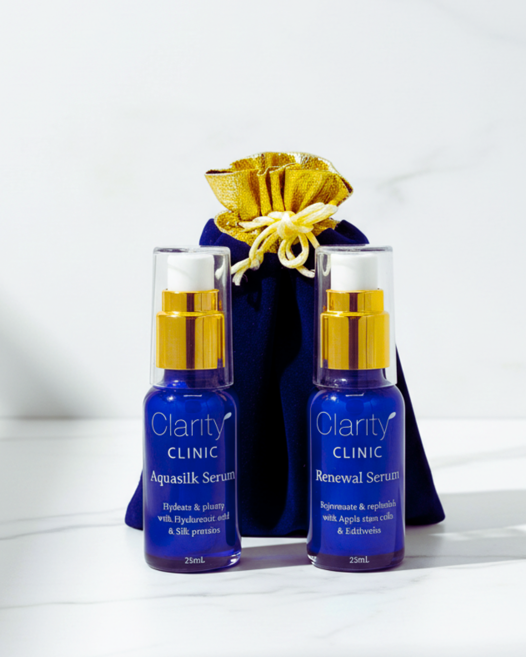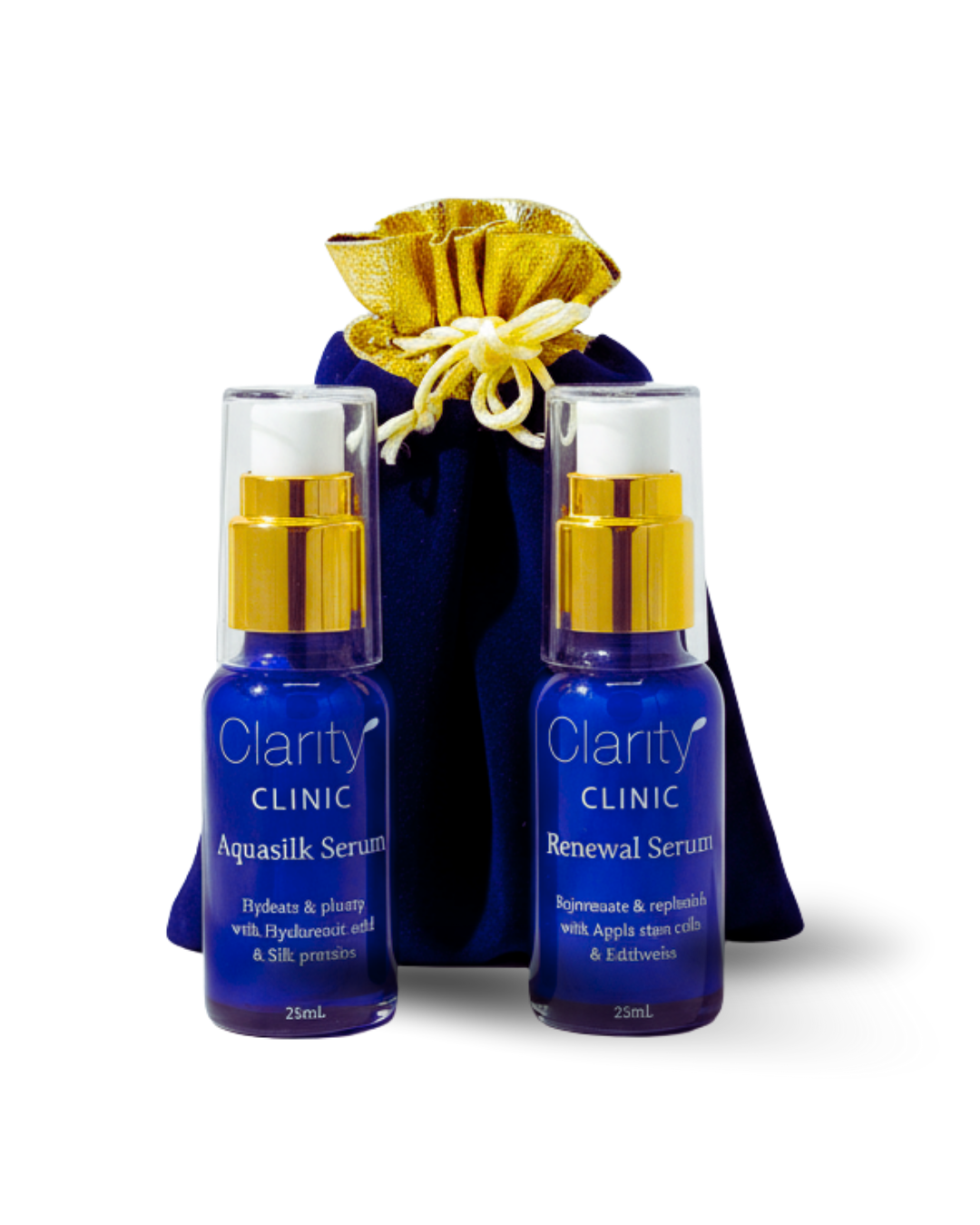 Two highly potent serums create an intensively rejuvenating experience for your skin. Packed with active ingredients they will elevate your skincare routine to the next level of effectiveness. Nestling in a gold topped blue velvet drawstring bag, they can easily go wherever you do, offering an instant skin pick-me-up.
